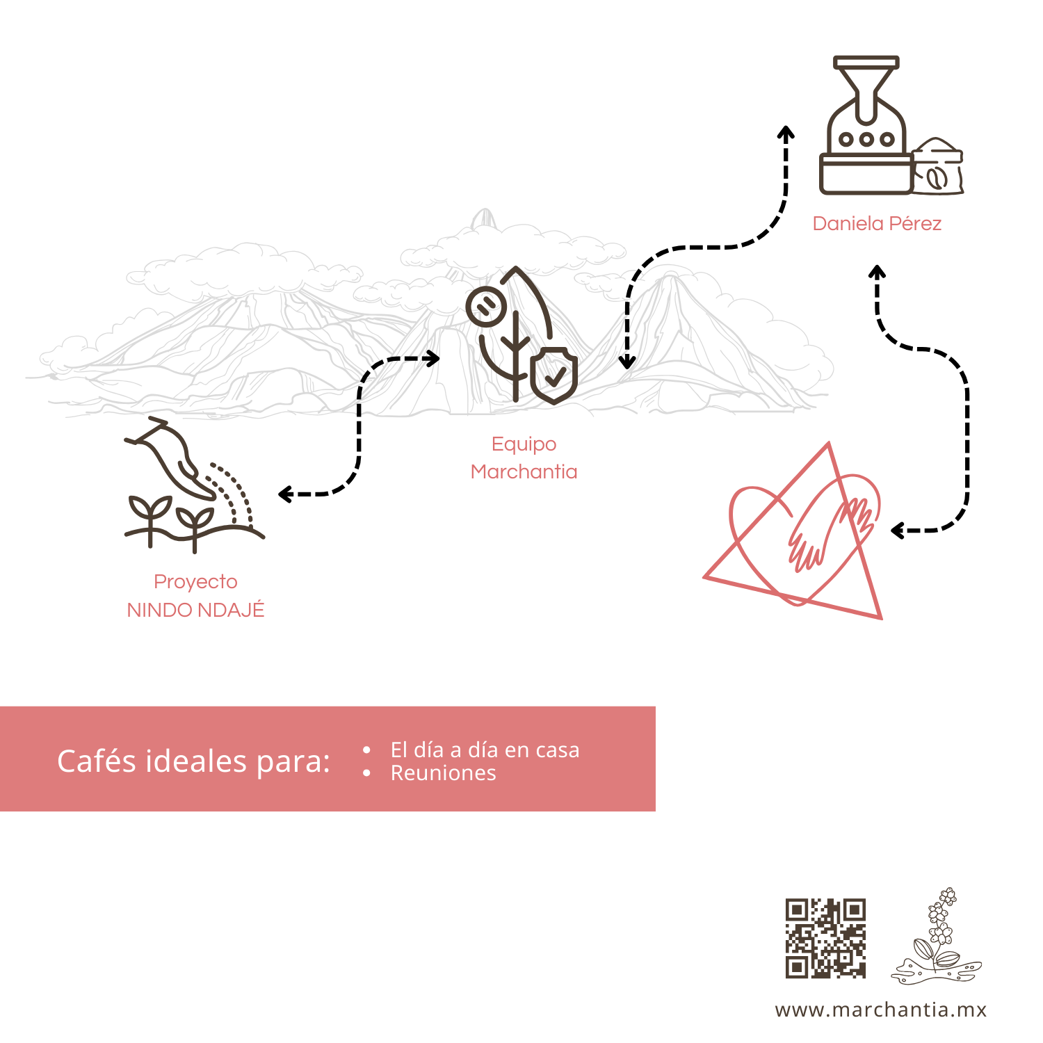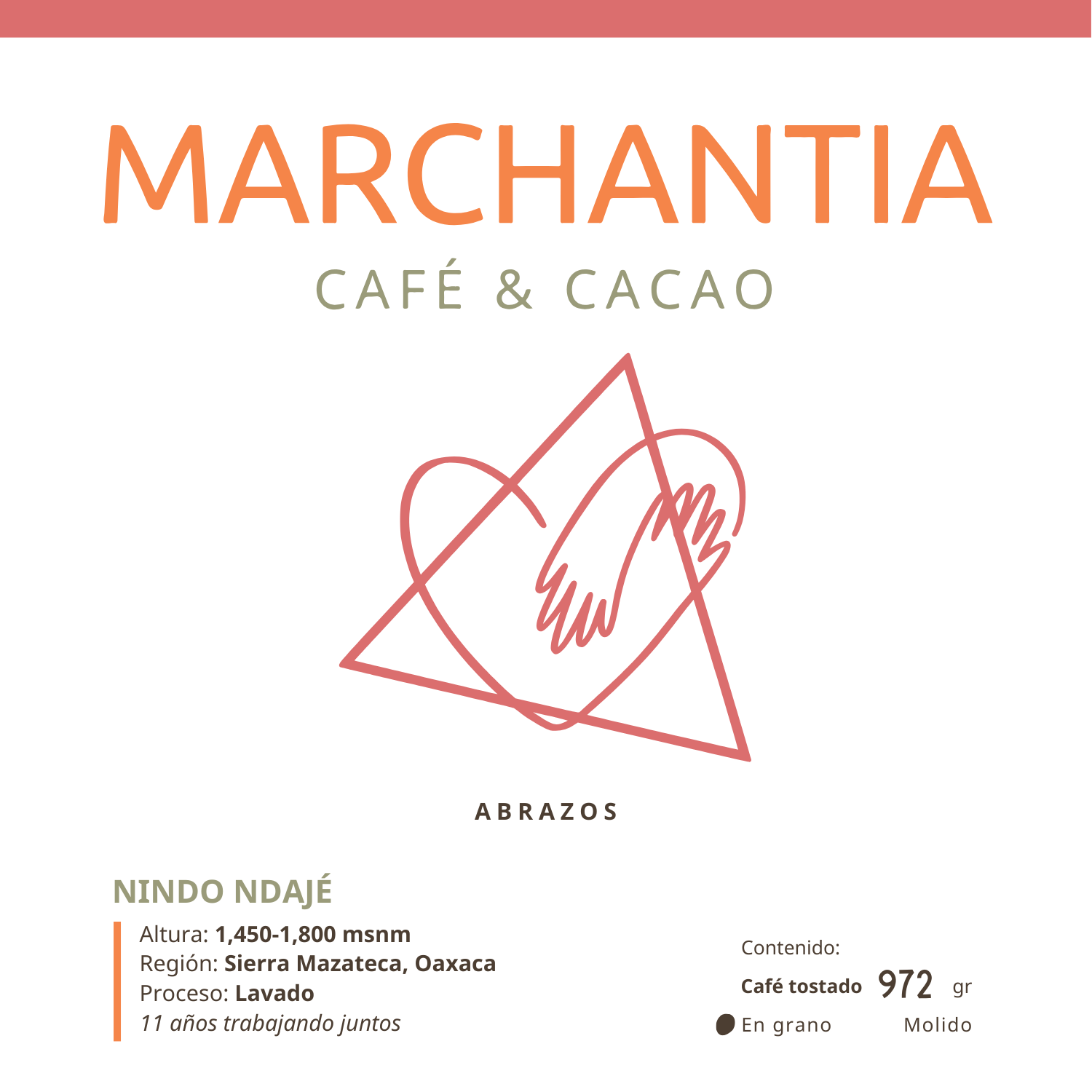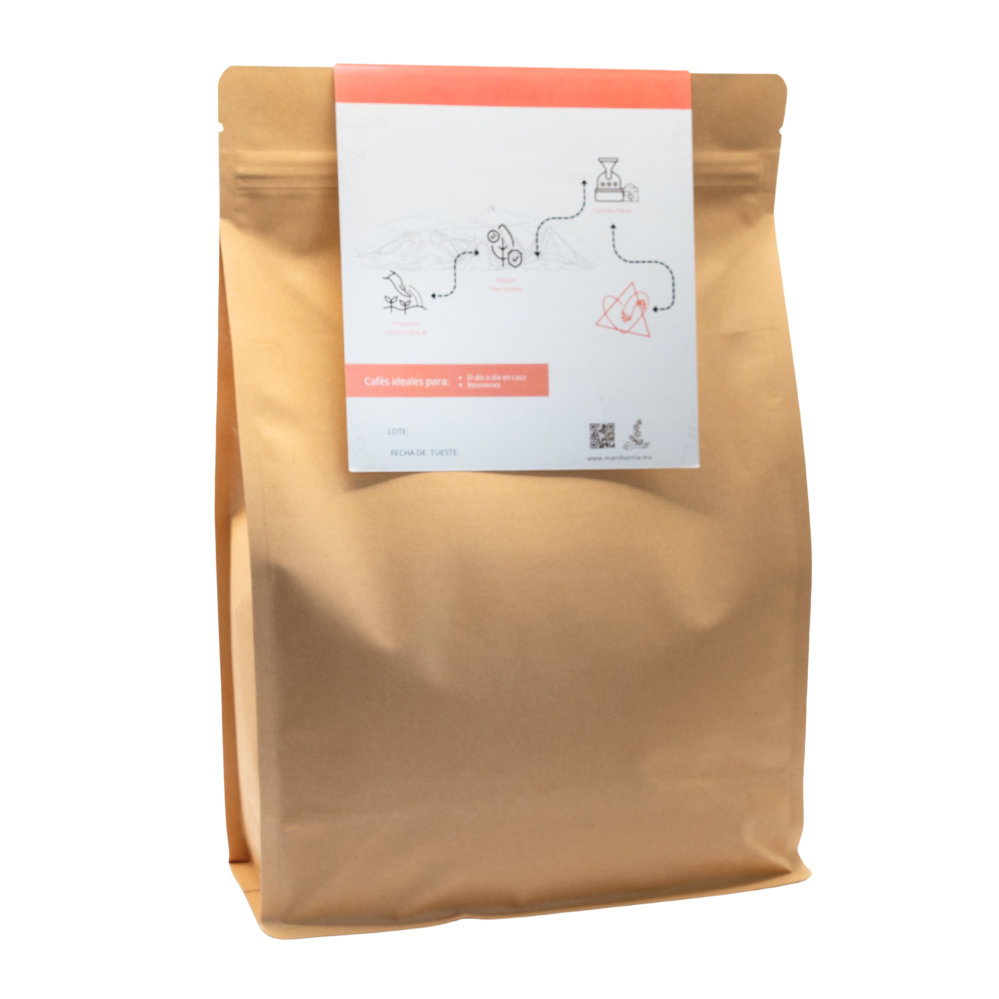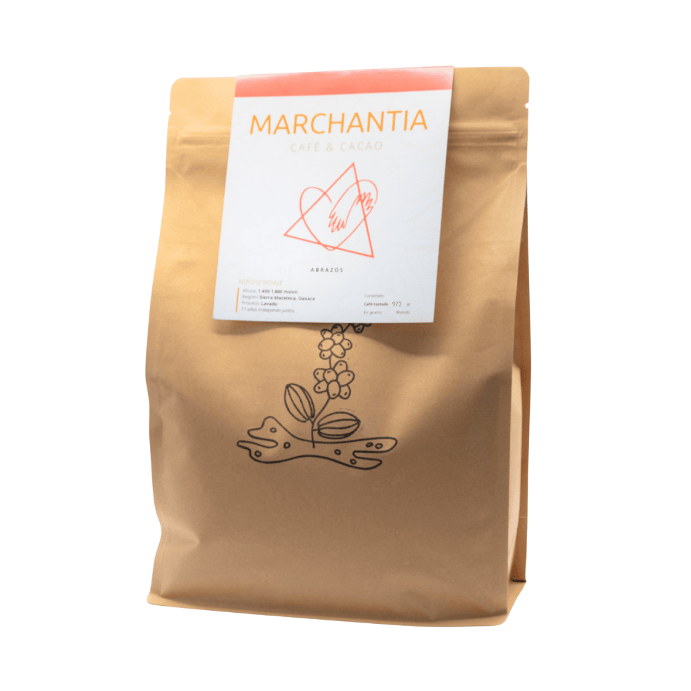 > CAFÉ EN GRANO / solicita en NOTAS si es molido. Agricultores: Nindo Ndajé Altura: 1,450-1,800 msnm | Región: Sierra Mazateca, Oaxaca | Proceso: Lavado | 11 años trabajando juntos | Asesoría agrícola: Equipo Marchantia | Tostadora invitada: Daniela Pérez