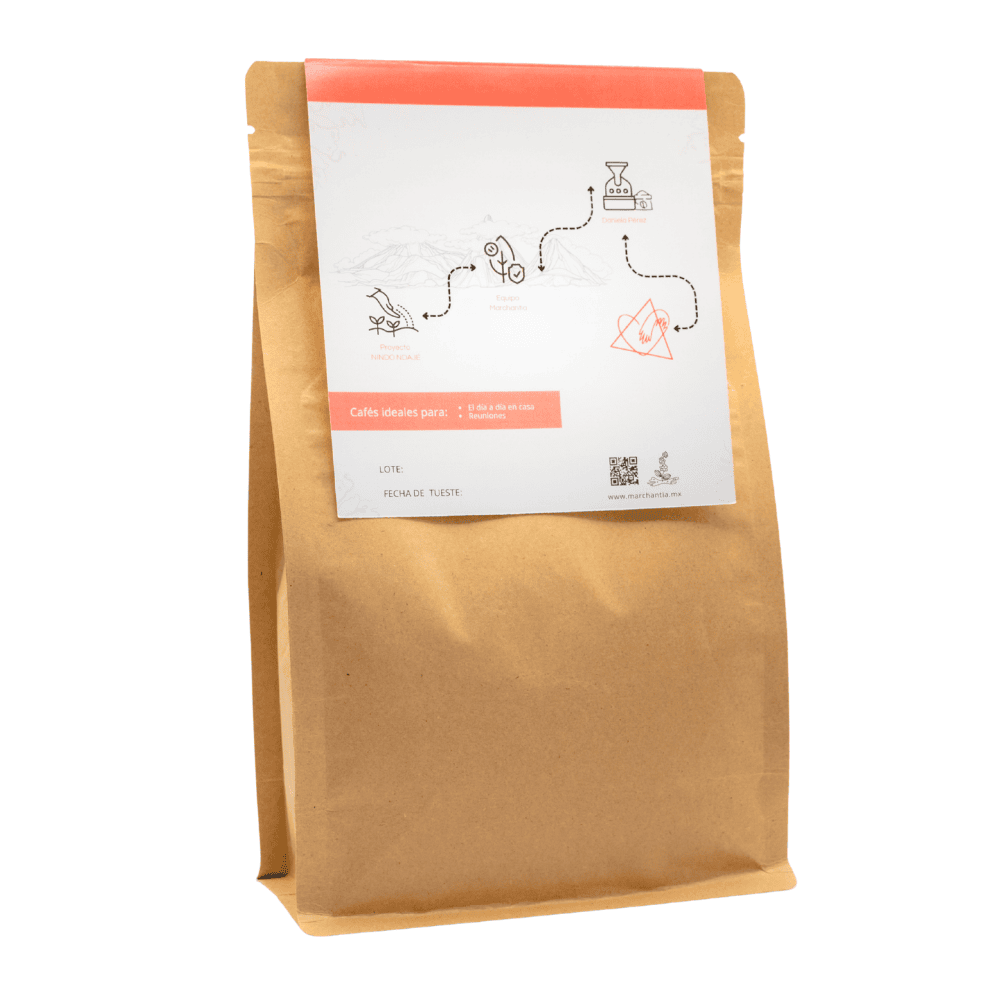 > CAFÉ EN GRANO / solicita en NOTAS si es molido. Agricultores: Nindo Ndajé Altura: 1,450-1,800 msnm | Región: Sierra Mazateca, Oaxaca | Proceso: Lavado | 11 años trabajando juntos | Asesoría agrícola: Equipo Marchantia | Tostadora invitada: Daniela Pérez